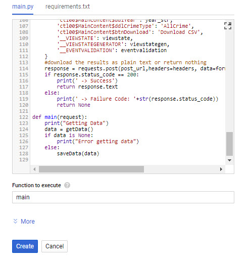 The default method in the main.py file specifies that one parameter will be passed in. So when I paste in my script I just need to update the main method to take one parameter. I won’t use it for anything, but if I don’t include it I’ll get an error in Stackdriver upon invocation. Then the last thing to do is to change the function to execute to “main”…