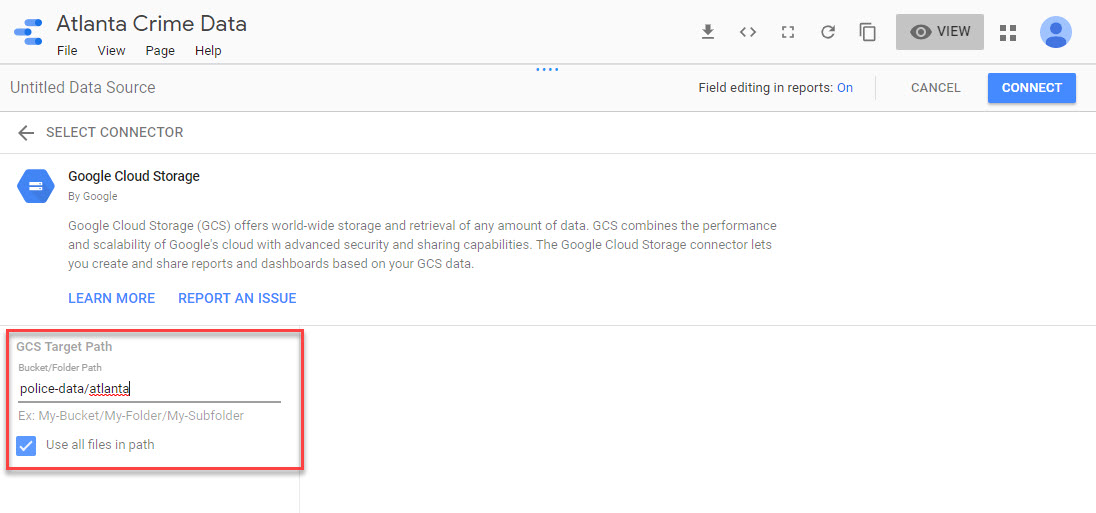 Before doing anything with Dataflow I can quickly mount this CSV into Data Studio to play with it. I’ll use the GCS connector and point to the bucket & sub-folder. Note the checkbox for using all of the files in the folder.