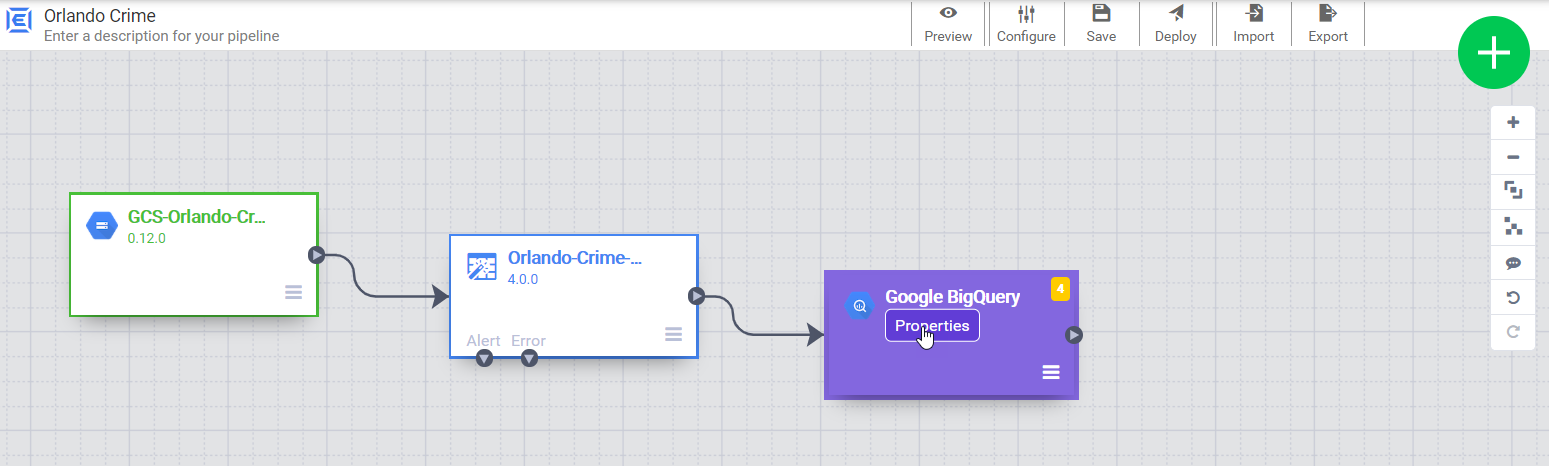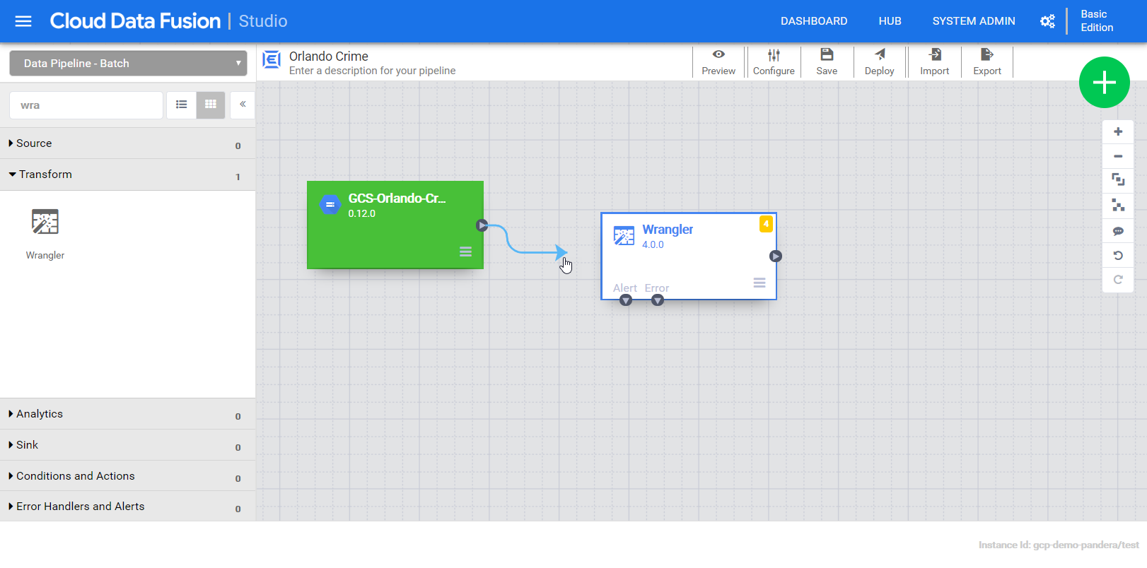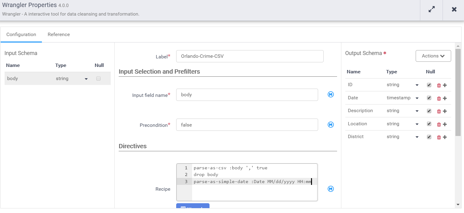 Now our pipeline has one field, “body”, that holds the entire content of the file. Next we add a wrangler to explore the content and define the schema. The output fields from the wrangler will be a the input for the BigQuery sink. Connecting them together establishes that relationship.