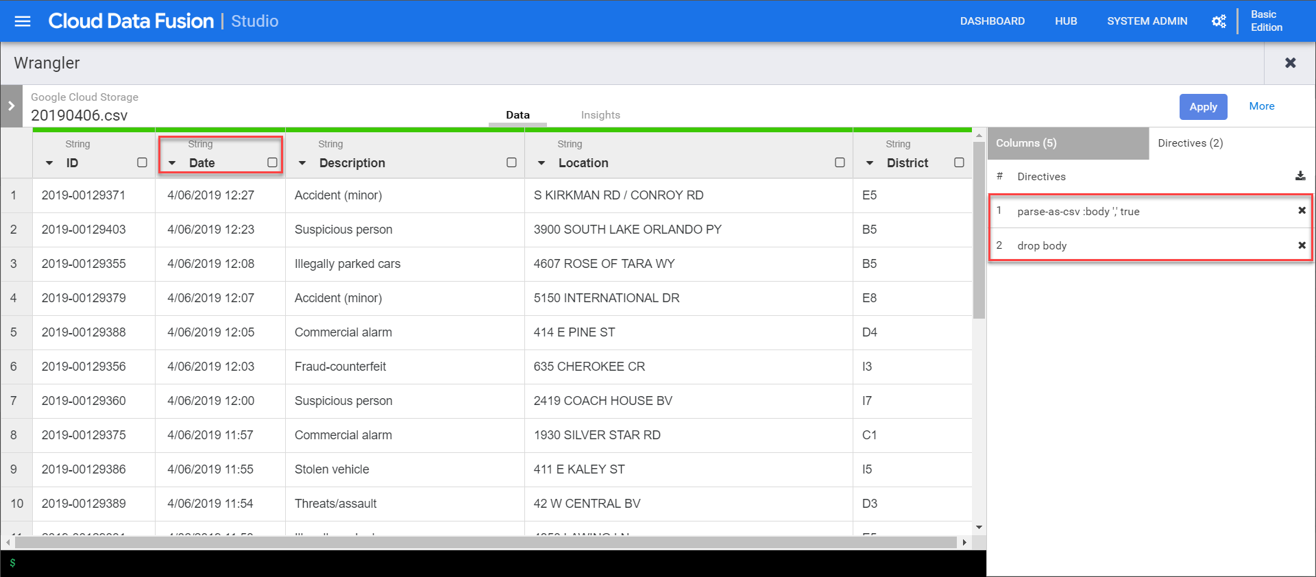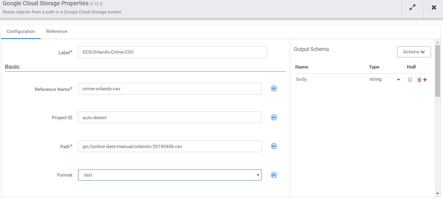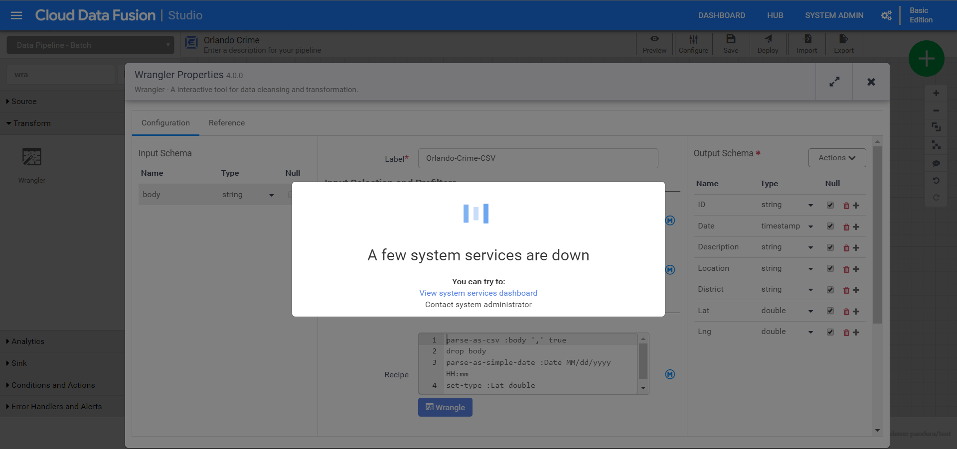 Now our pipeline has one field, “body”, that holds the entire content of the file. Next we add a wrangler to explore the content and define the schema. The output fields from the wrangler will be a the input for the BigQuery sink. Connecting them together establishes that relationship.