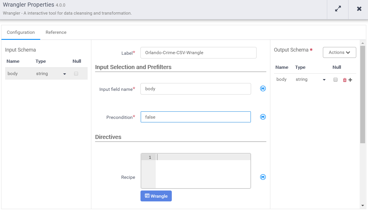 Notice that the input schema is “body” and it’s also the default output schema. We need to give it a label and a name. Then provide our recipe that transforms the input schema to the output schema.