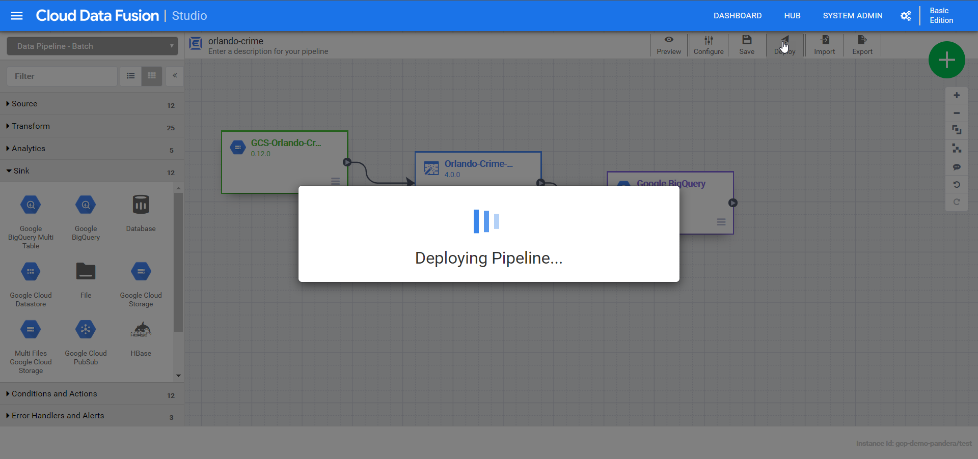 Now we can close the wrangler and add a BigQuery sink to the pipeline. We just need to give it a reference name, which is used to trace lineage (which can impact retention rules).