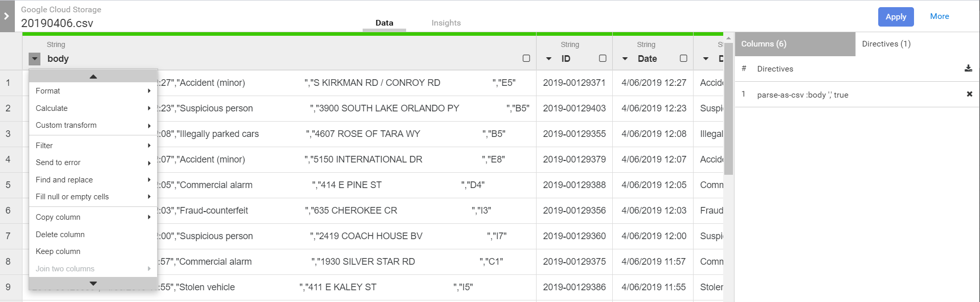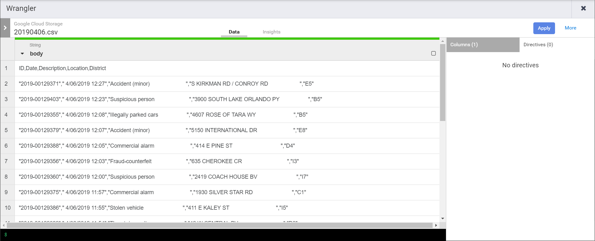 Notice that the columns are all string by default. We’ll need to convert them to their appropriate types. As we do that we’ll see new directives being added to the wrangler.